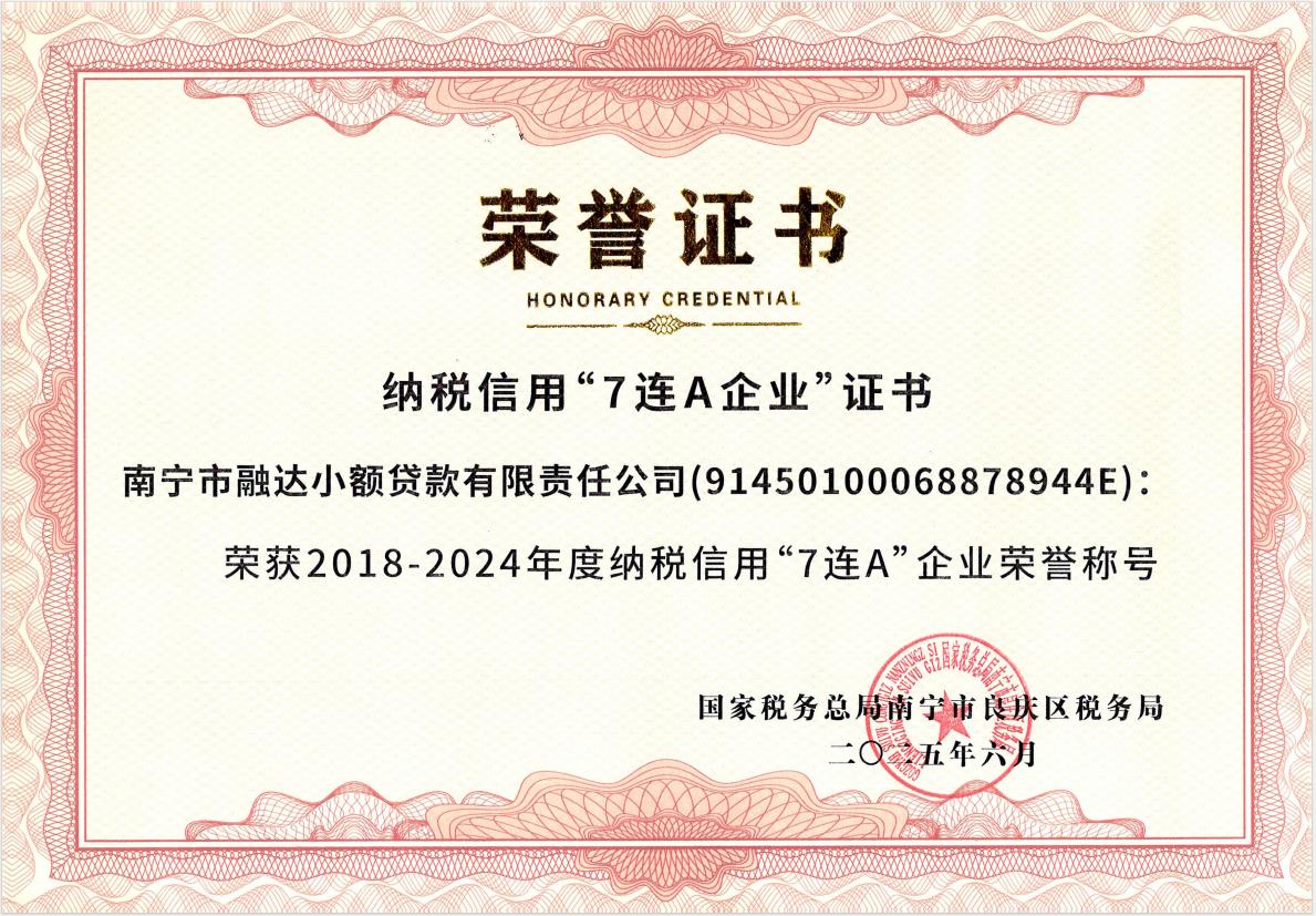 喜报!融达小贷公司荣获纳税信用“7连A”企业荣誉称号